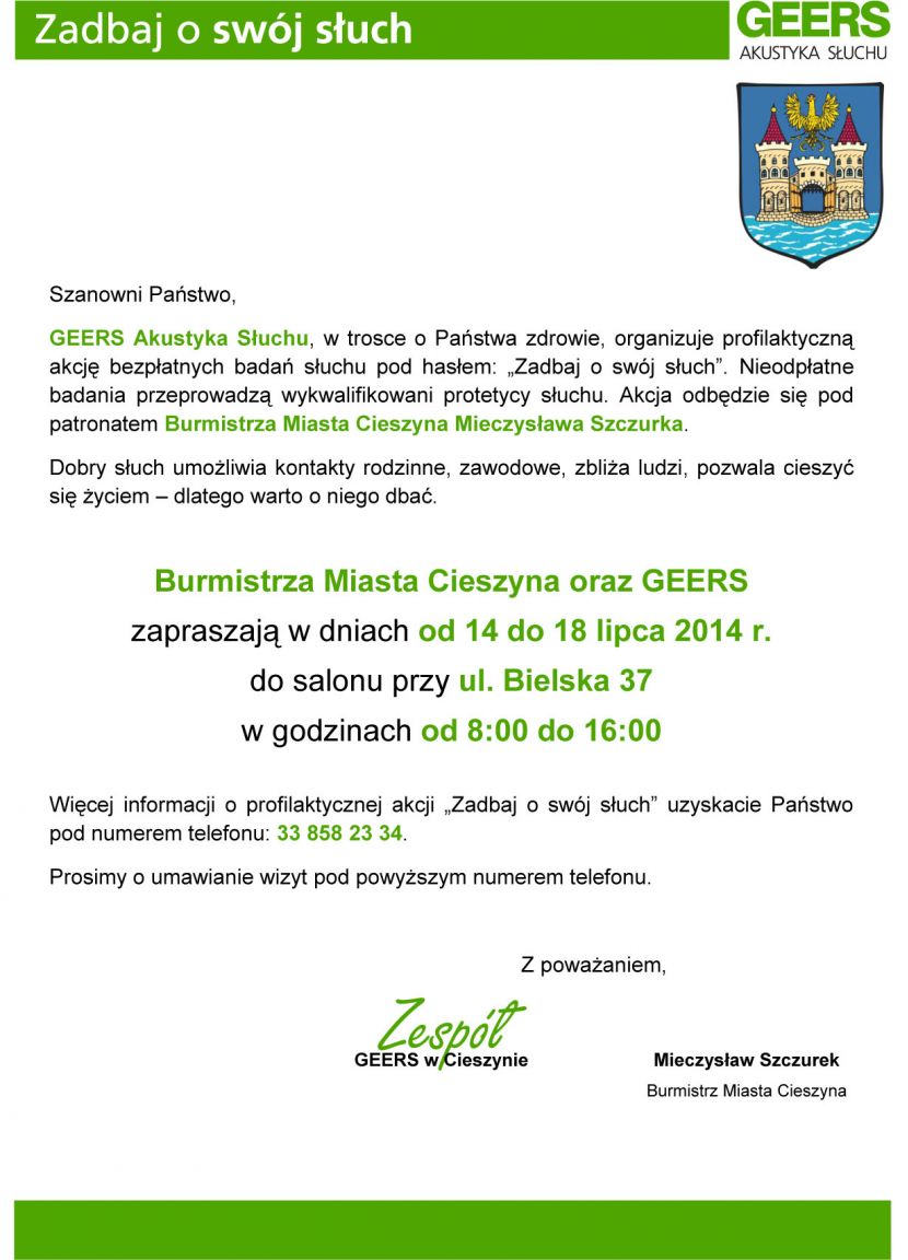 GEERS Akustyka Słuchu, w trosce o Państwa zdrowie, organizuje profilaktyczną akcję bezpłatnych badań słuchu pod hasłem: „Zadbaj o swój słuch”. Nieodpłatne badania przeprowadzą wykwalifikowani protetycy słuchu. Akcja odbędzie się pod patronatem Burmistrza Miasta Cieszyna Mieczysława Szczurka.