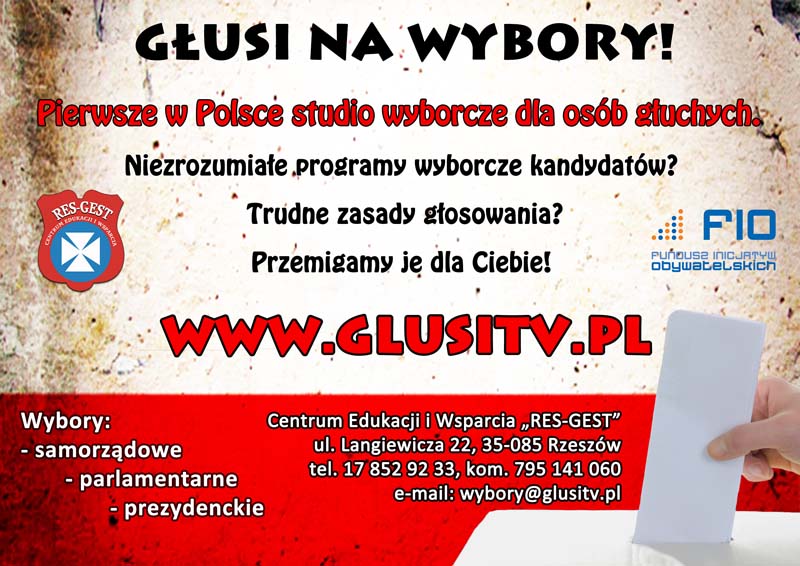 Projekt „Głusi na wybory – pierwsze w Polsce studio wyborcze dla osób głuchych i słabosłyszących” jest współfinansowany ze środków Programu Funduszu Inicjatyw Obywatelskich 2014-2015.