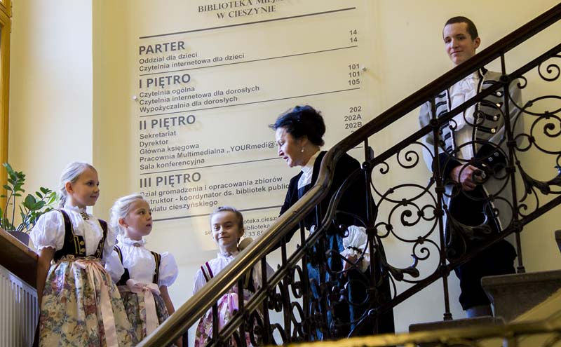 28 października miało miejsce uroczyste otwarcie cieszyńskiej biblioteki. Zaproszonych gości, którzy zebrali się w zabytkowym, pięknie odrestaurowanym holu na parterze budynku powitała dyrektor biblioteki Izabela Kula. Następnie o historii posesji i budynku, w którym mieści się biblioteka, opowiedział Mariusz Makowski, znany historyk, autor wielu publikacji nt. Śląska Cieszyńskiego. Wyreżyserował on również scenkę rodzajową, stanowiącą swoistą ilustrację do prelekcji, przedstawiającą wyjazd baronowej Gabrieli Czelesta z Ropicy na „zimowe leże” do cieszyńskiej kamienicy, w której obecnie działa biblioteka. Scenkę odegrali Barbara Karnas, która wystąpiła w roli baronowej, wraz z Jakubem Skałką (laufrem) oraz dziećmi z Zespołu Pieśni i Tańca Ziemi Cieszyńskiej.