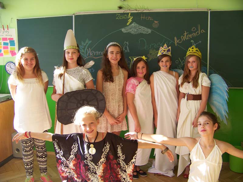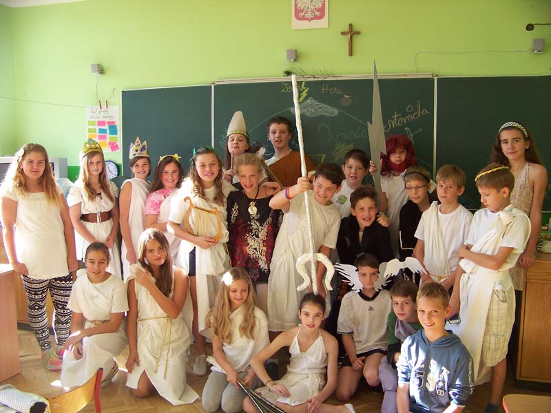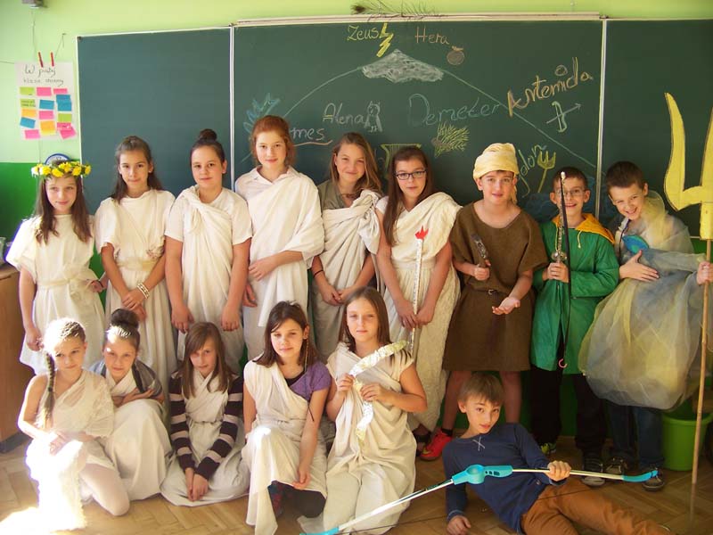 Gości uroczyście powitał Zeus, a następnie przy dźwiękach m.in. „Greka Zorby” zaprezentowali się inni bogowie: Hera, Demeter, Hestia, Posejdon, Hades, Atena, Hefajstos, Hermes, Apollo, Persefona i Afrodyta. Piątoklasiści przygotowali się do swych ról wzorowo. W klasie królowały piękne stroje, barwne makijaże i solidnie przygotowane rekwizyty - boskie atrybuty. Wszyscy wyśmienicie się bawili i z żalem powrócili na następne lekcje :).