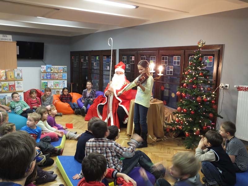 Nie zawiódł także najmłodszych czytelników Mikołaj, na przybycie którego mali bywalcy Biblioteki z niecierpliwością czekają co roku. Dobry święty przybył 9 grudnia aby rozdać słodkie prezenty grupie czytelników regularnie uczęszczających na zajęcia organizowane przez Oddział dla dzieci BM. Wizytę szacownego gościa zapowiedziała Małgorzata Kiereś – etnograf, przewodnik beskidzki, szefowa Muzeum Beskidzkiego w Wiśle - która uraczyła zebrane dzieci opowieścią o tym, jak dawniej w cieszyńskiem wyglądały wizyty świętego Mikołaja. Niejednego smyka zaskoczyła opowieść o skromnych podarkach, karaniu rózgą, czy psotnych diabłach.