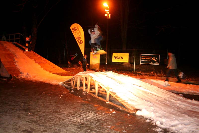 Typowy trening rozpoczyna się od przygotowania toru. Zawodnicy sami poprawiają skocznie, ucząc się przy okazji, jak budować. Następnie obowiązkowa rozgrzewka, gimnastyka trwa ok. 15 min i potem trening, czyli nauka i doskonalenie od najprostszych elementów typu zjazd, skok, aż do ewolucji z obrotami. Mamy do wykorzystania skocznię, mini tor dla początkujących i przeszkodę jibbingową – dodaje Michał Andrzejewski.