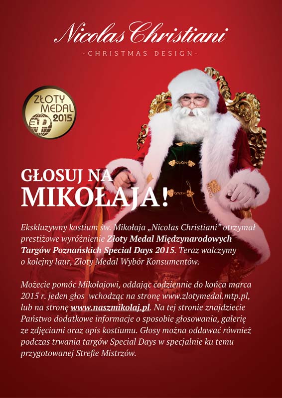 Szanse naszego Mikołaja na kolejny złoty medal są duże, jednak jego konkurenci są bardzo silni. Mikołaj potrzebuje Waszego wsparcia. Zrób prezent Mikołajowi, oddając codziennie jeden głos w internetowym głosowaniu konsumentów, prowadzonym na stronie www.zlotymedal.mtp.pl.