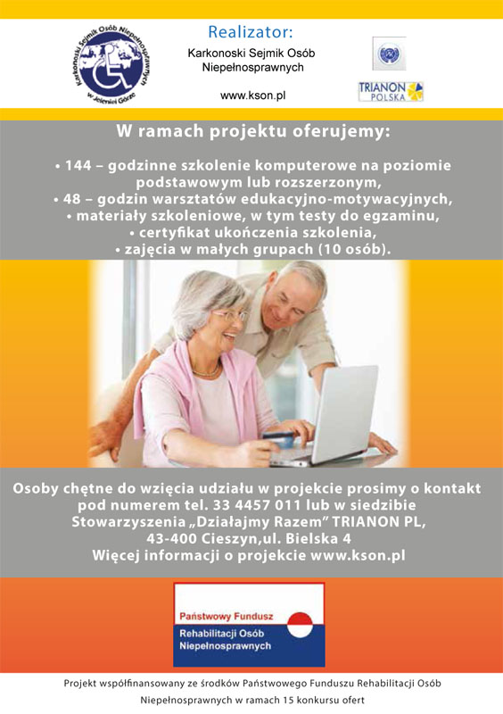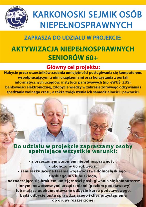 W projekcie mogą wziąć udział osoby niepełnosprawne, które ukończyły 60 rok życia, zamieszkują na terenie województwa śląskiego odznaczające się brakiem umiejętności posługiwania się komputerem i innymi nowoczesnymi urządzeniami (poziom podstawowy) lub mające udokumentowane odbycie kursu podstawowego, bądź odbycie testu sprawdzającego i chęć przystąpienia do grupy rozszerzonej.
