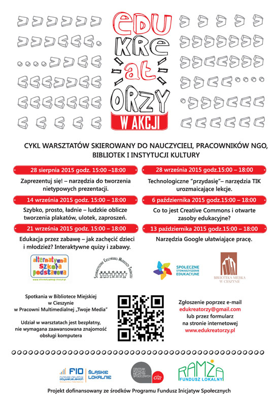 Zapraszamy wszystkich głodnych nowych umiejętności. Projekt realizowany i finansowany jest ze środków Funduszu Inicjatyw Obywatelskich - Śląskie Lokalnie. Udział w spotkaniach jest bezpłatny. Terminarz i tematyka spotkań dostępne są na stronie internetowej www.edukreatorzy.pl . Zgłoszenia : edukreatorzy@gmail.com lub przez formularz na stronie internetowej.