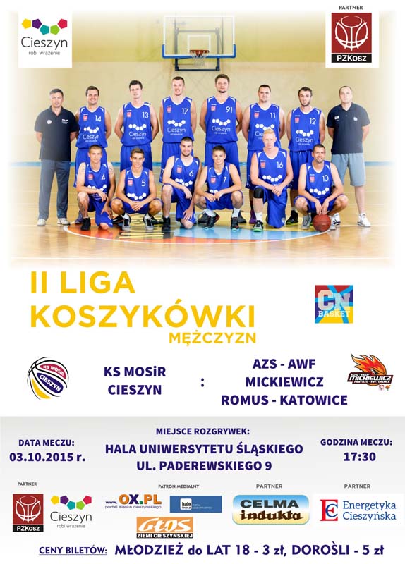 Pierwszym rywalem cieszyńskiej drużyny będzie AZS AWF Mickiewicz Romus II Katowice, stworzony z połączenia pierwszo- i drugoligowego zespołu. Siła rywala zależy od tego, jaki skład na ten pojedynek zestawią trenerzy. Jednak na korzyść miejscowych przemawia występ przed własną publicznością, a także wynik niedawnego sparingu, w którym koszykarze z Cieszyna okazali się nieznacznie lepsi od sobotnich rywali.