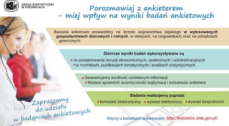 Linki do informacji o badaniach ankietowych http://stat.gov.pl/informacja-o-badaniach-ankietowych/ http://katowice.stat.gov.pl/co-gdzie-jak-zalatwic/gdy-skontaktuje-sie-z-nami-ankieter/.Prosimy o przychylność i współpracę z ankieterami.
