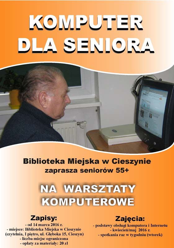 Seniorzy 55+ zainteresowani udziałem w darmowym szkoleniu z obsługi komputera i Internetu, mogą zapisać się na kurs "Komputer dla seniora" od 14 marca 2016 r., od godz. 8.00, w czytelni cieszyńskiej Biblioteki (ul. Głęboka 15, I piętro). Kurs trwać będzie 7 tygodni, spotkania odbywać się będą we wtorki. Osoby uczestniczące w warsztatach otrzymają materiały szkoleniowe, których koszt wynosi 20 zł za cały kurs (płatne przy zapisie).