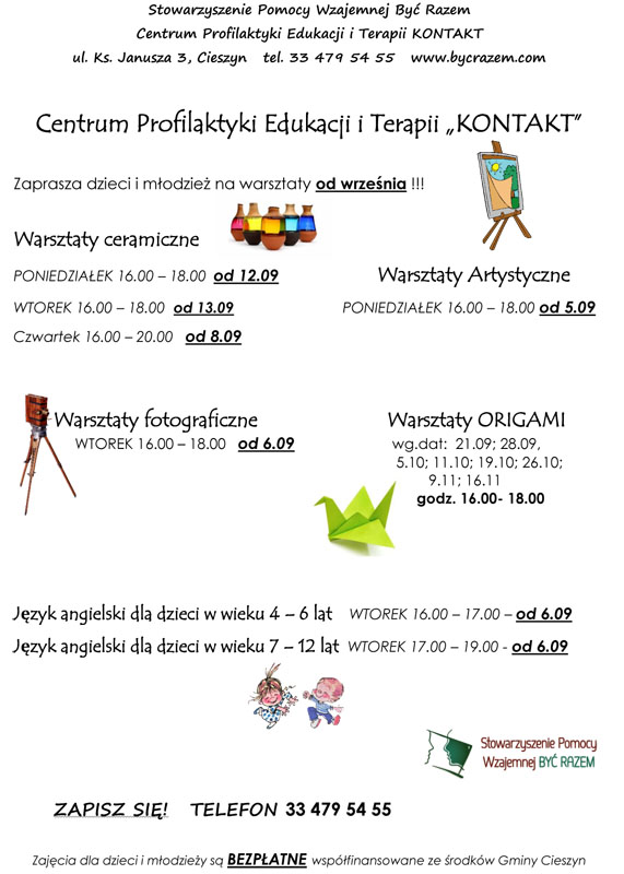 Wraz ze zbliżającym się nowym rokiem szkolnym od 5 września w Centrum Profilaktyki Edukacji i Terapii „Kontakt” Stowarzyszenia Pomocy Wzajemnej „Być Razem” w Cieszynie przy ul. ks. Janusza 3 ruszają BEZPŁATNE WARSZTATY dla dzieci i młodzieży z Cieszyna, oraz cieszyńskich szkół. Udział w zajęciach rozwija zainteresowania, poszerza pasje, pomaga odkryć nowe talenty a także sprzyja pielęgnowaniu relacji rodzinnych.