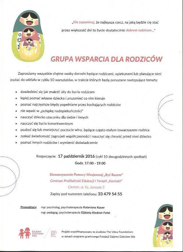 Serdecznie zapraszamy wszystkich rodziców, opiekunów, oraz osoby planujące nimi zostać na uczestnictwo w Grupie Wsparcia Dla Rodziców.