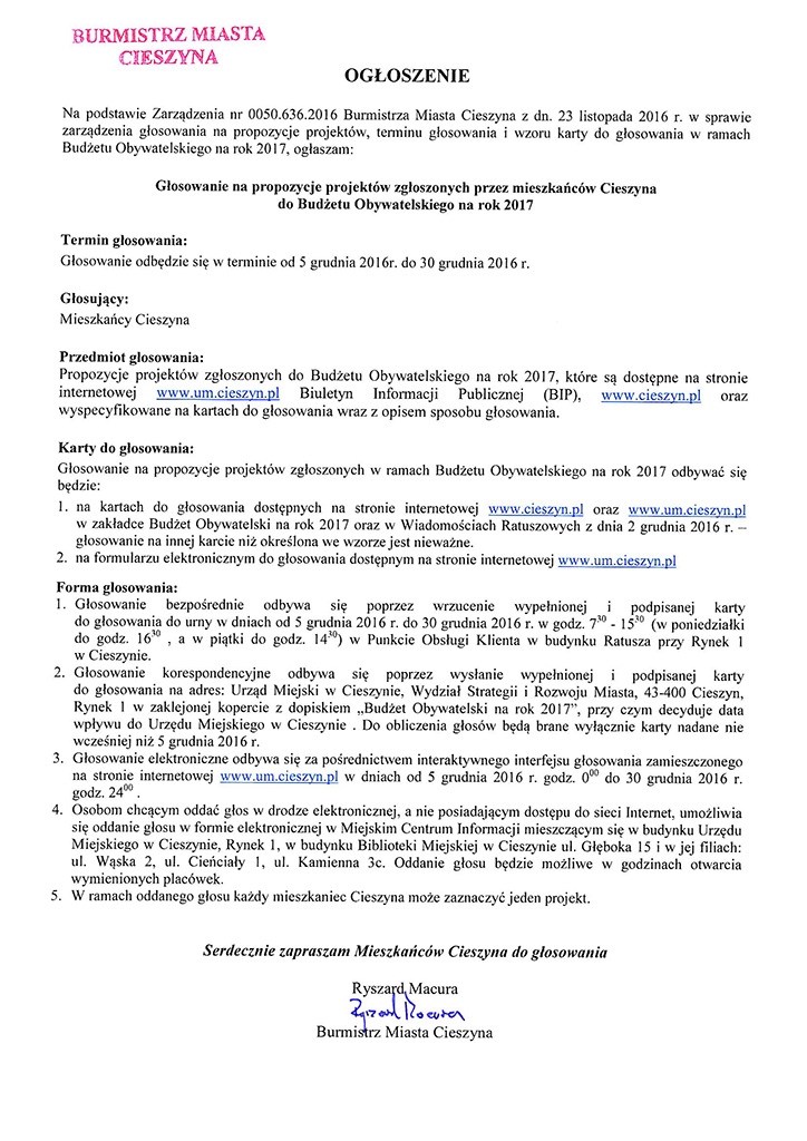 Ogłoszenie o głosowaniu na propozycje projektów zgłoszonych przez mieszkańców Cieszyna do Budżetu Obywatelskiego na rok 2017.