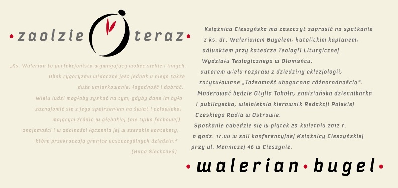 Spotkanie z cyklu "Zaolzie teraz" Jego bohaterem będzie ks. dr Walerian Bugel, katolicki kapłan, adiunkt przy Katedrze Teologii Liturgicznej Wydziału Teologicznego w Ołomuńcu, autor wielu rozpraw z dziedziny eklezjologii.
