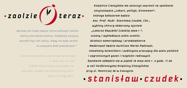 Kolejne spotkanie z cyklu "Zaolzie teraz" Jego bohaterem będzie Ass. Prof. Mudr. Stanisław Czudek, CSc., wybitny chirurg uhonorowany tytułem "Lekarza Republiki Czeskiej 2009 r.", uczony i wykładowca wielu uczelni, działacz samorządowy i przedsiębiorca.