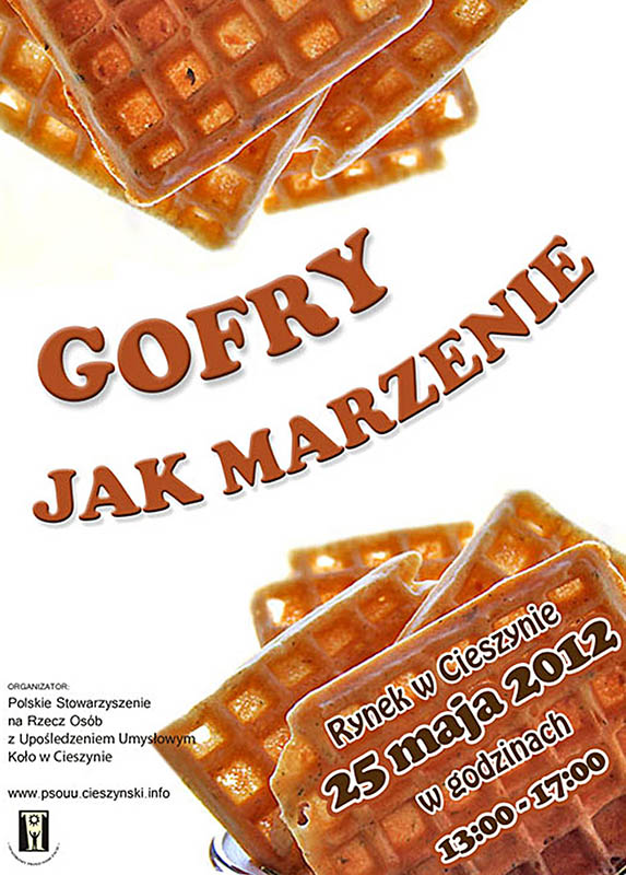25 maja 2012r. w godzinach 13.00-17.00 na cieszyńskim Rynku, Polskie Stowarzyszenie na Rzecz Osób z Upośledzeniem Umysłowym Koło w Cieszynie, organizuje kolejną imprezę o charakterze plenerowym pod hasłem „GOFRY JAK MARZENIE”.