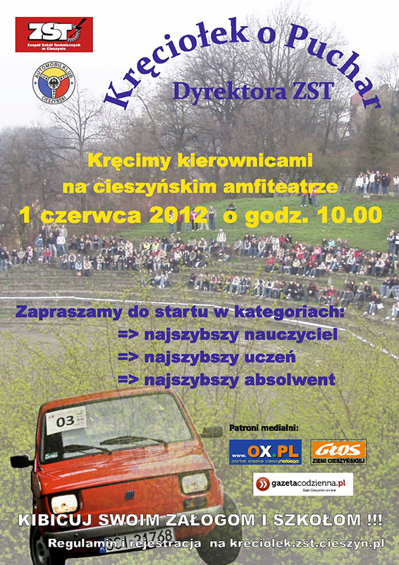 Z okazji Dnia Dziecka Zespół Szkół Technicznych wraz z Automobilklubem Cieszyńskim organizują „Kręciołka Samochodowego o Puchar Dyrektora ZST”. Impreza odbędzie się 1 czerwca 2012r. w cieszyńskim amfiteatrze. Rywalizacja rozpocznie się o godzinie 10.00, chętnych do wzięcia udziału zapraszamy na godzinę 9.00