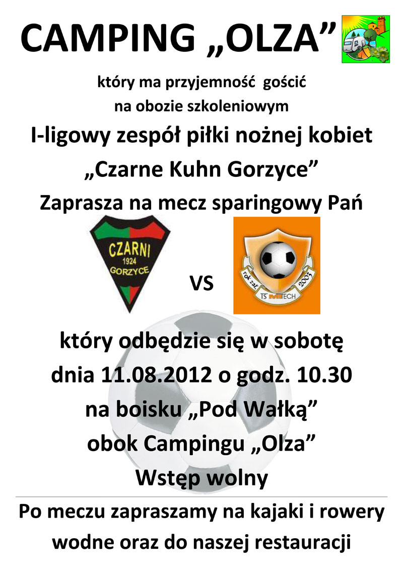 CAMPING „OLZA” który ma przyjemność gościć na obozie szkoleniowym I-ligowy zespół piłki nożnej kobiet „Czarne Kuhn Gorzyce” Zaprasza na mecz sparingowy Pań który odbędzie się w sobotę dnia 11.08.2012 o godz. 10.30 na boisku „Pod Wałką” obok Campingu „Olza”