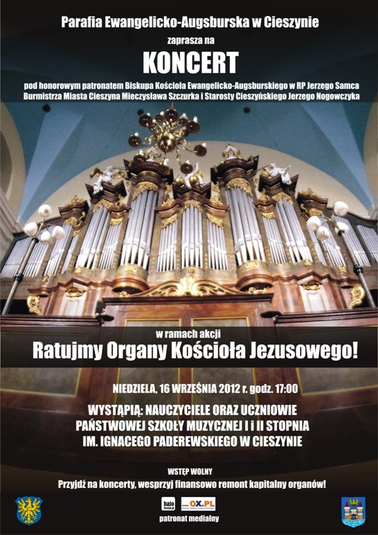 Po koncercie zbierane będą środki na rzecz kapitalnego remontu zabytkowych, 36-głosowych organów firmy Sauer z 1923 r. Wspaniały instrument, którego barokowy prospekt oraz ponad 100 piszczałek zachowało się z poprzednich organów autorstwa Franza Horziczki z Frydku (1785r.), jest bardzo zniszczony m.in. przez żerujące w nim kołatki.