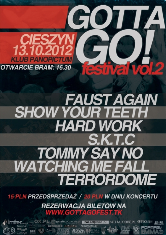 | Uwagi | Już 13 października 2012 r. w cieszyńskim Klubie Studenckim Panopticum odbędzie się druga edycja alternatywnego festiwalu Gotta Go. Jak twierdzą organizatorzy: Po sukcesie ubiegłorocznej edycji imprezy postanowiliśmy rozwijać naszą inicjatywę. Wspiera nas miasto oraz lokalni partnerzy oraz cała masa patronów medialnych, którym zależy na tym, aby na terenie Śląska Cieszyńskiego działo się jak najwięcej. Na dzień dzisiejszy dopinamy ostatnie szczegóły związane z organizacją imprezy, ale już teraz zapraszamy na odwiedzanie naszej strony internetowej na której znajdziecie wszelkie potrzebne info, zarówno o tym jak dojechać do klubu, kto zagra oraz informacje o biletach i możliwości ich rezerwacji. W tym roku postawiliśmy na bardziej zróżnicowany skład, więc każdy zwolennik gitarowego grania, niezależnie czy to metal czy punk, znajdzie coś dla siebie. Oprócz atrakcji koncertowych dla uczestników imprezy przewidziana jest strefa NGO, możliwość zakupu wegetariańskich posiłków dzięki Vegan Forfiters czy stoisko z płytami oraz koszulkami Spook Records |
