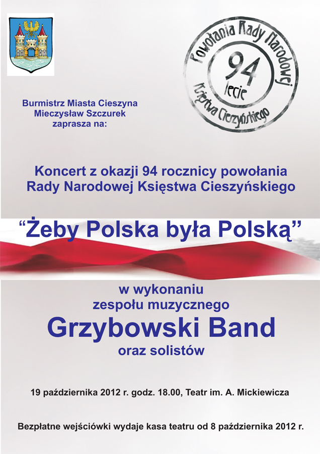 W związku z kolejną rocznicą tych ważnych wydarzeń Burmistrz Miasta Cieszyna, Mieczysław Szczurek, zaprasza mieszkańców na koncert okolicznościowy pt. : ”Żeby Polska była Polską”, który odbędzie się w Teatrze im. A. Mickiewicza w dniu 19 października 2012 r. o godz. 18.00. W programie znajdą się znane piosenki polskie wpisujące się w historię naszego kraju od lat międzywojennych, po współczesność, w nowych, atrakcyjnych opracowaniach muzycznych Jarosława Grzybowskiego, w wykonaniu zespołu muzycznego Grzybowski Band oraz  solistów
