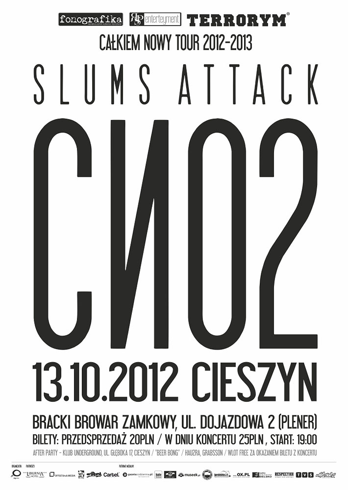13 października 2012 roku w Cieszynie, na terenie arcyksiążęcego Browaru (Bracki Browar Zamkowy), przy ul. Dojazdowej 2, wystąpi PEJA/SLUMS ATTACK na koncercie premierowym płyty CNO2 "CAŁKIEM NOWE OBLICZE 2" w ramach trasy CAŁKIEM NOWY TOUR 2012 / 2013. Impreza plenerowa!