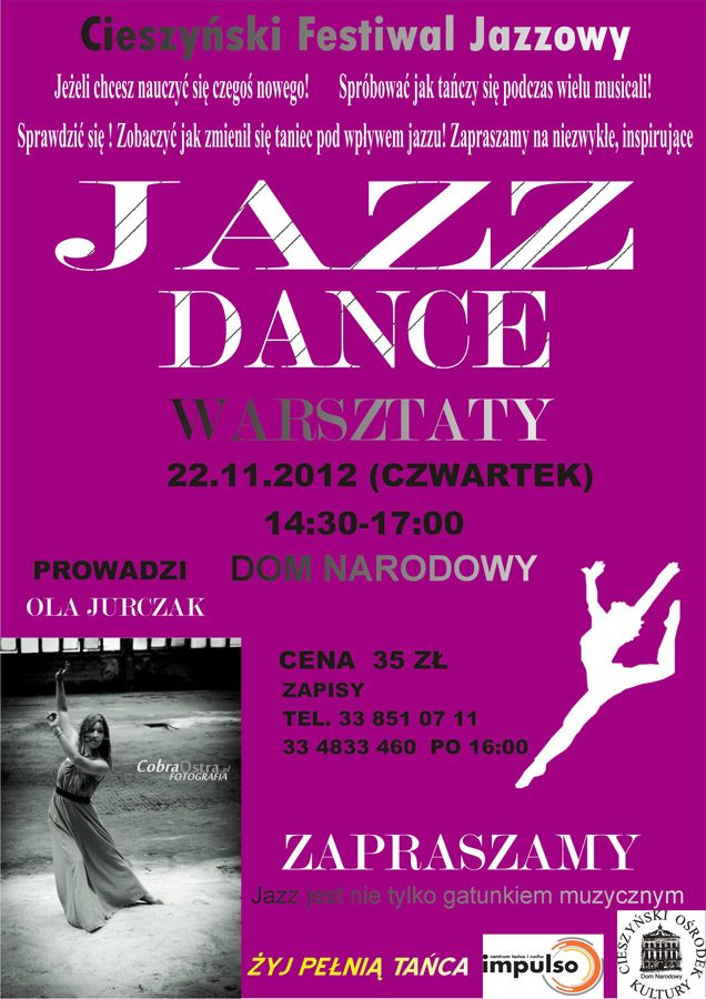 Zapraszamy młodych ludzi na niezwykłe, inspirujące WARSZTATY JAZZ DANCE ,które odbędą w ramach Cieszyńskiego Festiwalu Jazzowego. Prowadzone przez utalentowaną zdobywczynię wielu nagród Olę Jurczak z Centrum Tańca i Ruchu Impulso. Jazz to nie tylko gatunek muzyki!
