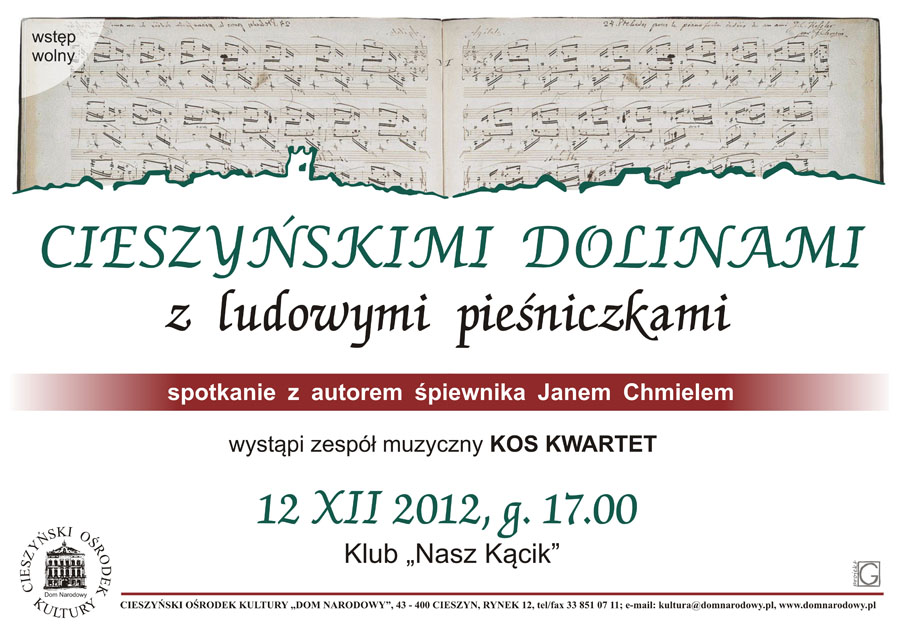 „CIESZYŃSKIMI DOLINAMI Z LUDOWYMI PIEŚNICZKAMI” – spotkanie z autorem śpiewnika Janem Chmielem. Wystąpi zespół muzyczny KOS KWARTET