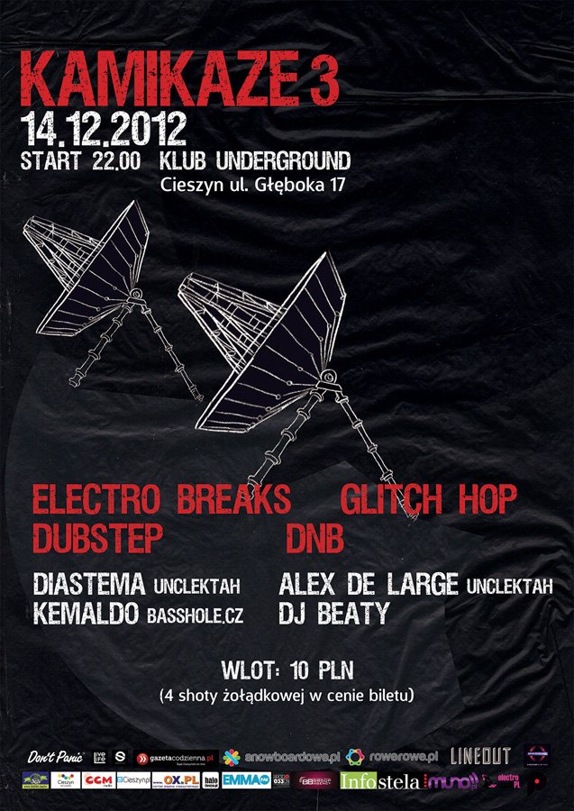 To już trzecia edycja epickich melanży z cyklu KAMIKAZE ! na tą okazję zaprosiliśmy dla was gości specjalnych grubego formatu Dj Beaty & Kemaldo 14.12 odwiedzą nasz kraj gwarantując wam wyjątkowo wyczesany poczes. Dodatkowo w cenie biletu w wysokości 10 zł serwujemy 4 shoty żołądkowej dla każdego !