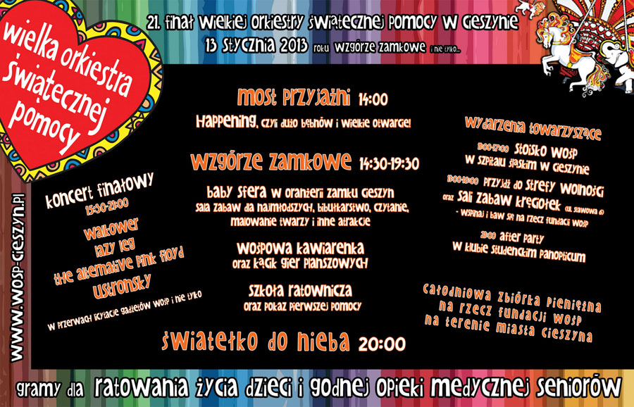 Wielki Finał zaplanowany jest na niedzielę 13 stycznia. Dzień rozpoczniemy szkoleniem dla wolontariuszy, którzy wyruszą w miasto z kolorowymi puszkami. Od godzin popołudniowych, zaczniemy grać jeszcze głośniej – tradycyjnie na Wzgórzu Zamkowym, dzięki uprzejmości naszych przyjaciół – dyrekcji Zamku Cieszyn. W programie przewidziane jest wiele propozycji wśród których każdy znajdzie coś dla siebie oraz tradycyjny Finałowy Koncert i ogniste Światełko do Nieba, po który wystąpi gwiazda wieczoru – zespół Ustronsky. (szczegóły poniżej).