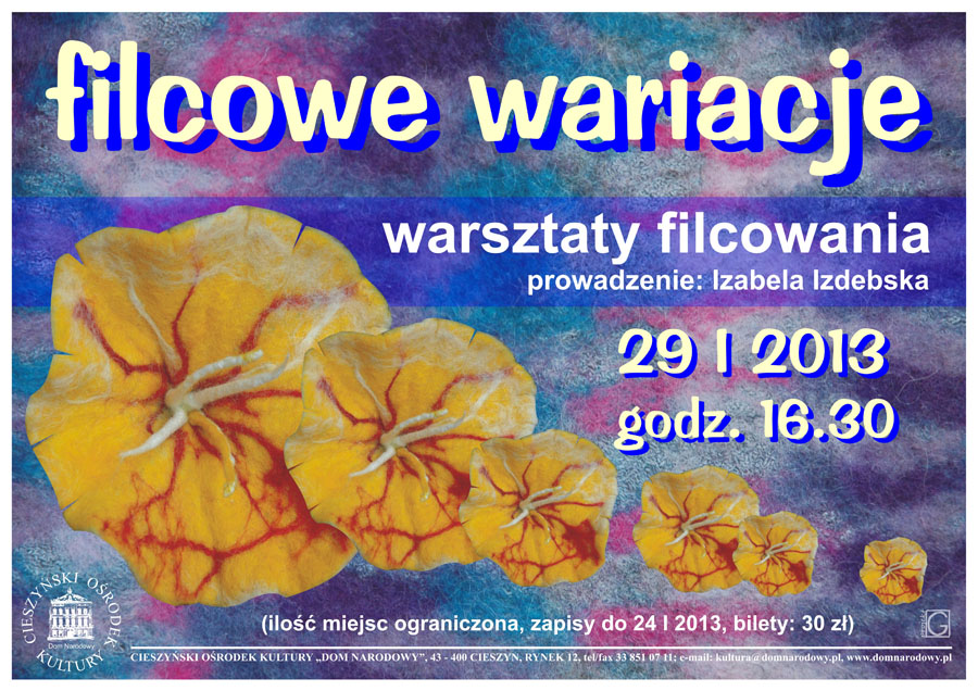 Przy pomocy zgręblowanego runa owczego, wody i siły własnych rąk można uzyskać niepowtarzalne, artystyczne efekty z filcu. Podczas zajęć uczestnicy warsztatów wykonają formę płaską - podkładkę pod kubek, formę przestrzenną - kolorowy kwiat i zabawkę - myszkę. Zajęcia poprowadzi instruktorka Izabela Izdebska - absolwentka Akademii Sztuk Pięknych w Krakowie i Wyższej Szkoły Pedagogicznej w Częstochowie.
