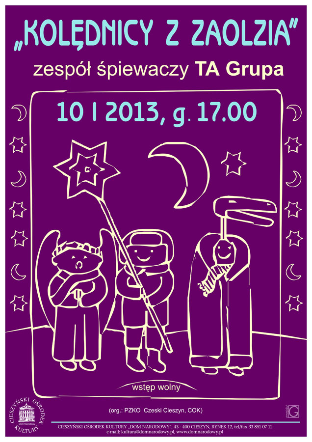 Cieszyński Ośrodek Kultury „Dom Narodowy” zaprasza 10 stycznia o godz. 17.00 na spotkanie pt. „Kolędnicy z Zaolzia”. Wystąpią: Zespół śpiewaczy TA Grupa (PZKO, Czeski Cieszyn), Klemens Słowioczek - baryton, Wanda Miech i Remigiusz Gąsior – akompaniament