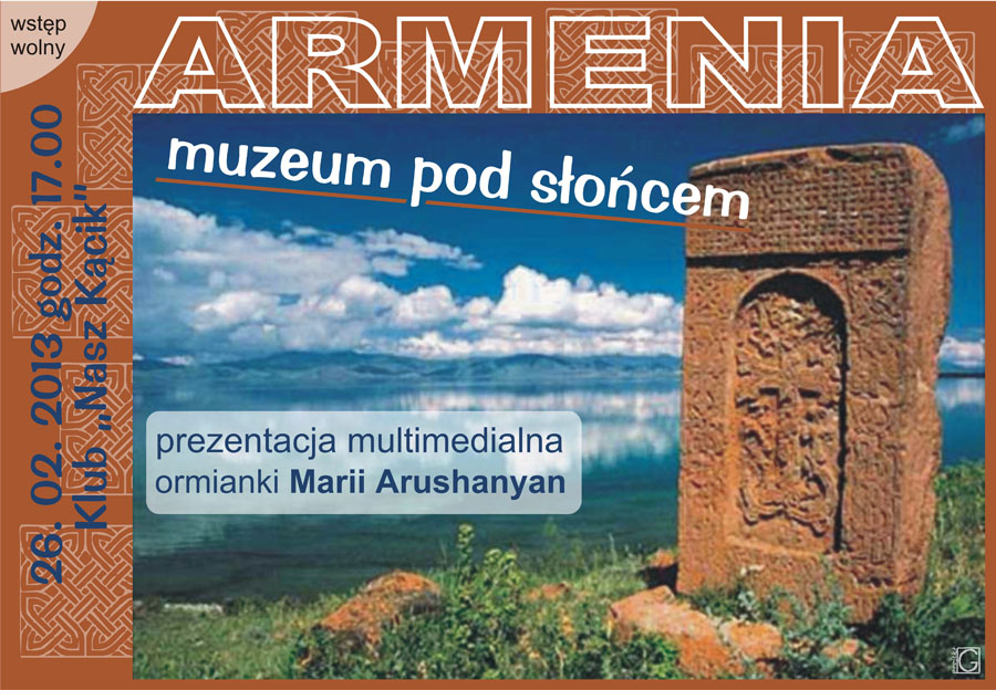 Cieszyński Ośrodek Kultury „Dom Narodowy” zaprasza 26 lutego na prezentację multimedialną ormianki Marii Arushanyan „Armenia –muzeum pod słońcem”. Maria Arushanyan pochodzi z Gyumri w centralnej Armenii. Jest absolwentką psychologii i pedagogiki specjalnej. Od trzech lat mieszka w Ustroniu gdzie pracuje w ośrodku dla niepełnosprawnych dzieci jako wolontariusz w ramach europejskiego projektu EVS. Podczas spotkania wirtualnie odwiedzimy 11 „województw” (marz) Armenii. Zobaczymy miejsca które warte są zobaczenia oraz dowiemy się jakie są lokalne przysmaki.