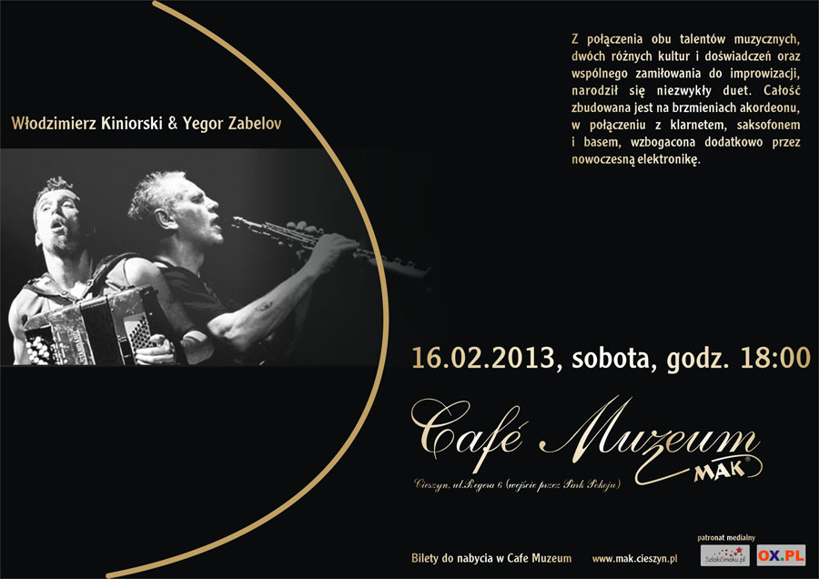 W Cieszynie wystapi z z białoruskim mistrzem akordeonu guzikowego Yegorem Zabelovem. Z połączenia obu talentów muzycznych, dwóch różnych kultur i doświadczeń oraz wspólnego zamiłowania do improwizacji, narodził się niezwykły duet. Całość zbudowana jest na brzmieniach akordeonu, w połączeniu z klarnetem, saksofonem i basem, wzbogacona dodatkowo przez nowoczesną elektronikę.