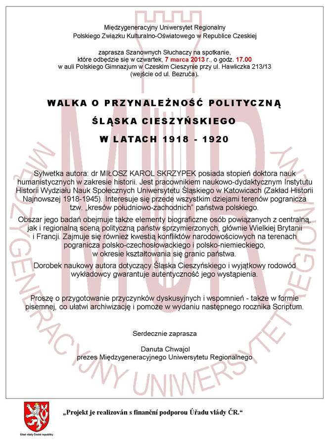 | Miejsce | Polskie Gimnazjum w Czeskim Cieszynie, ul. Hawliczka 213/13 |