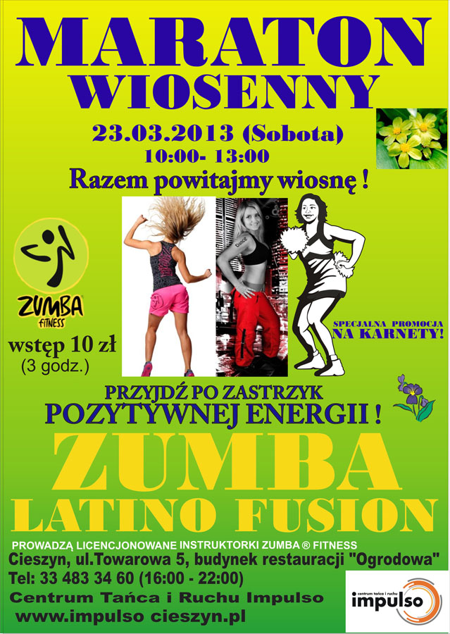 Z okazji pierwszego wiosennego weekendu zapraszamy Cię na dodatkowy zastrzyk pozytywnej energii w postaci taneczno-fitnessowych zajęć Zumby i Latino Fusion. Zapraszamy na trzy godziny wypełnione tańcem,ruchem, śmiechem i radością.