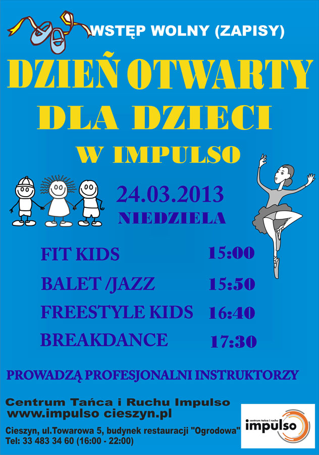 Jeżeli Twoje dziecko lubi tańczyć i ma mnóstwo energii to zapraszamy na Dzień Otwarty dla Dzieci w Impulso. Zajęcia prowadzą doświadczeni instruktorzy.