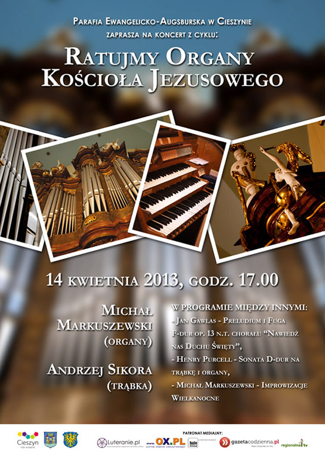 W niedzielę, 14 kwietnia 2013 r. o godz. 17:00 w kościele Jezusowym w Cieszynie zainaugurowany zostanie drugi cykl koncertów w ramach akcji 'Ratujmy Organy Kościoła Jezusowego'. Podczas uroczystego koncertu zatytułowanego 'O Zmartwychwstały' ponownie zabrzmią zabytkowe romantyczne organy firmy Sauer. Znakomity instrument, który w bieżącym roku obchodzi swoje 90-te urodziny, pilnie potrzebuje generalnego remontu. Podczas koncertu inauguracyjnego, odbywającego się pod honorowym patronatem Biskupa Kościoła Ewangelicko-Augsburskiego w RP Jerzego Samca, Burmistrza Miasta Cieszyna Mieczysława Szczurka i Starosty Cieszyńskiego Jerzego Nogowczyka, wystąpią Michał Markuszewski (organy) oraz Andrzej Sikora (trąbka). W programie m.in.: Jan Gawlas - Preludium i Fuga F-dur op. 13 n.t. chorału "Nawiedź nas Duchu Święty", Henry Purcell - Sonata D-dur na trąbkę i organy, Jeremiah Clarke - Marsz Księcia Danii oraz Michał Markuszewski - Improwizacje n.t. znanych pieśni wielkanocnych. Organizator akcji, Parafia Ewangelicko-Augsburska w Cieszynie, serdecznie zaprasza wszystkich na tę niezwykłą muzyczną ucztę. Wzorem ubiegłego roku, podczas koncertów zbierane będą środki na rzecz remontu zabytkowych organów. Więcej informacji na temat akcji, instrumentu oraz wykonawców koncertu znaleźć można na stronie www.ratujmyorgany.pl.