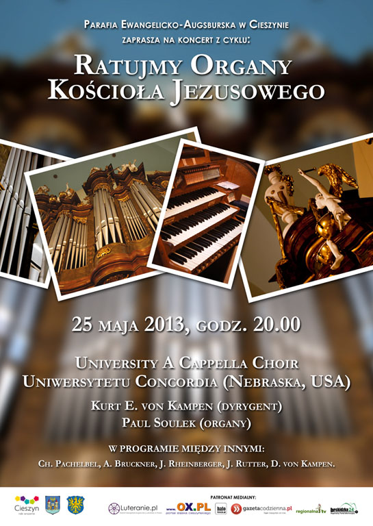 W sobotę, 25 maja 2013, o godz. 20:00 w kościele Jezusowym w Cieszynie odbędzie się kolejny koncert w ramach akcji „Ratujmy Organy Kościoła Jezusowego”. Wystąpi University A Capella Choir uniwersytetu Concordia w Nebrasce (USA). Chór założony został w 1939 roku i należy do najstarszych uniwersyteckich chórów w USA. Odnosi wiele sukcesów na licznych festiwalach i konkursach. Chórzyści z Nebraski koncertowali już m.in. w Egipcie, Izraelu, Indiach, Tajlandii, Japonii, Hong Kongu, Australii oraz w wielu krajach europejskich. 72 młodych śpiewaków zaprezentuje w Cieszynie ciekawy repertuar pieśni religijnych. W programie m.in. Ch.T. Pachelbel, A. Bruckner, J. Rheinberger oraz współczesne kompozycje J. Rutter’a. Dyrygent: Kurt E. von Kampen. Organy: Paul Soulek.
