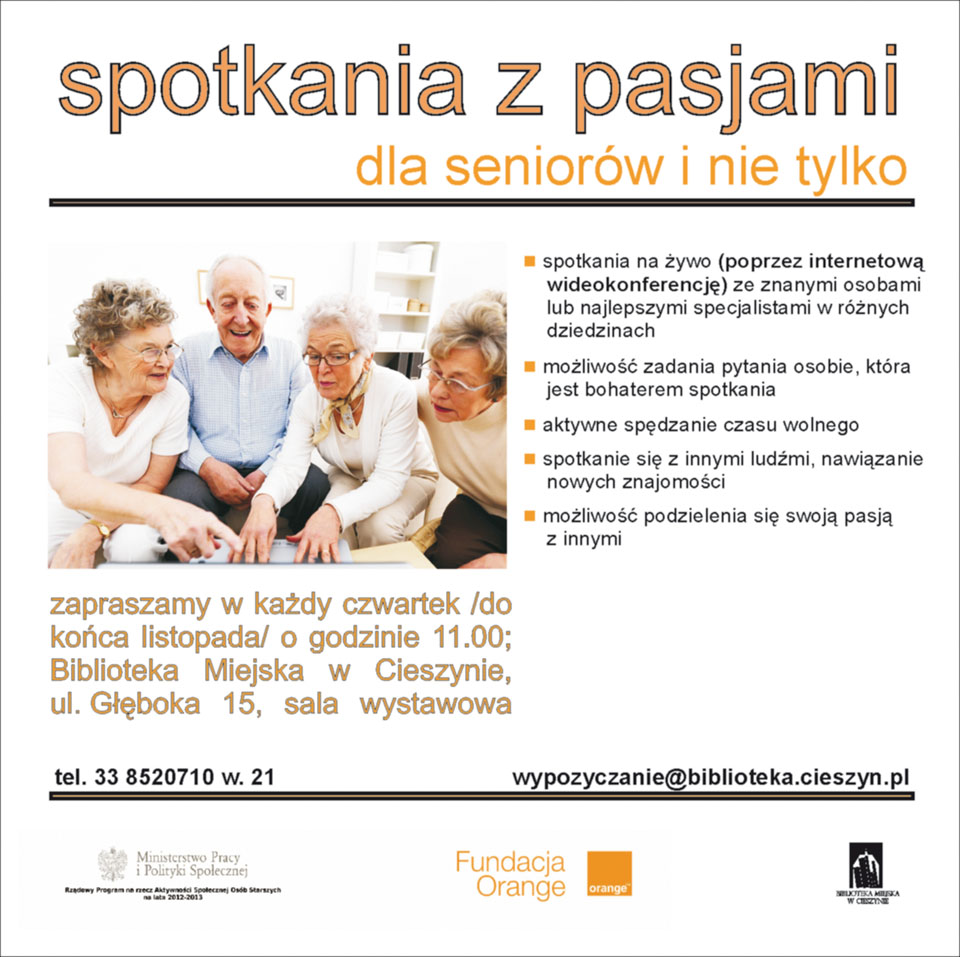 Biblioteka Miejska w Cieszynie oraz Fundacja Orange, serdecznie zapraszają seniorów, do udziału w nowym cyklu pt. „Spotkania z pasjami”.