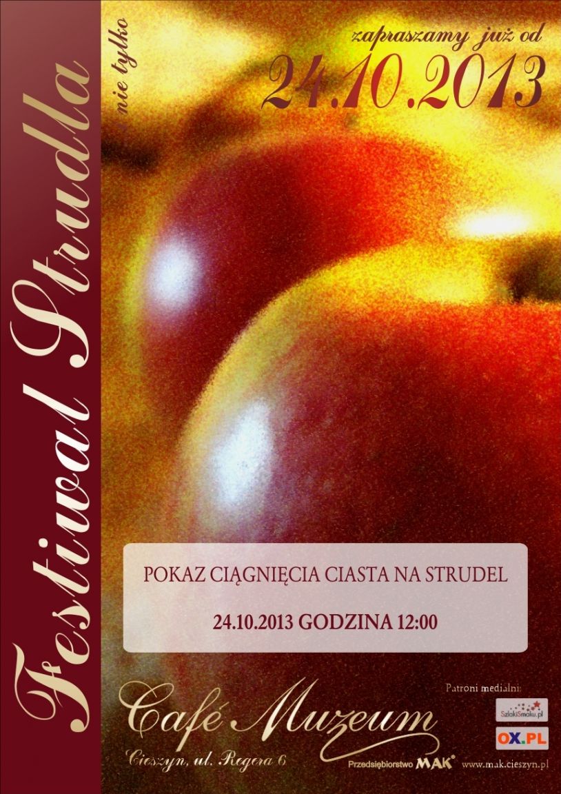 Z tej okazji w Cafe Muzeum już od 24.10.2013 o godz. 12 pokazem rozciągania ciasta na strudel rozpocznie się kolejny FESTIWAL STRUDLA JABŁKOWEGO I NIE TYLKO.