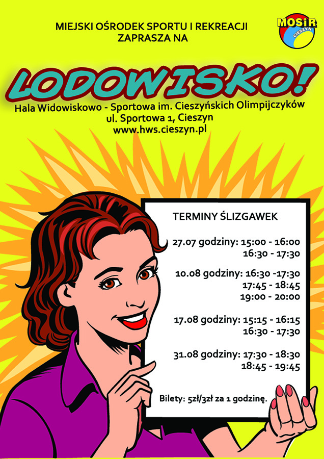 MOSiR Cieszyna zaprasza na... lodowisko! Terminy i godziny korzystania ze ślizgawki na plakacie.
