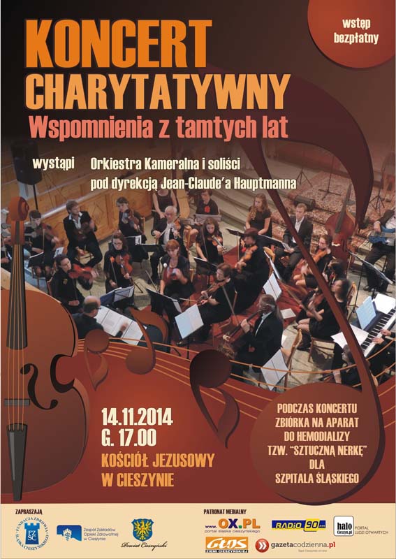 W piątek 14 listopada o godz. 17:00 mieszkańcy Cieszyna i okolic będą mieli okazję uczestniczyć w wyjątkowym wydarzeniu kulturalnym. W Kościele Jezusowym Parafii Ewangelicko-Augsburskiej w Cieszynie wystąpi Orkiestra Kameralna i soliści pod dyrekcją Jean-Claude’a Hauptmanna w Koncercie Charytatywnym „Wspomnienia z tamtych lat”. Motywem przewodnim koncertu będzie upamiętnienie i oddanie czci twórcom i założycielom Szpitala Śląskiego oraz Fundacji Zdrowia Śląska Cieszyńskiego.