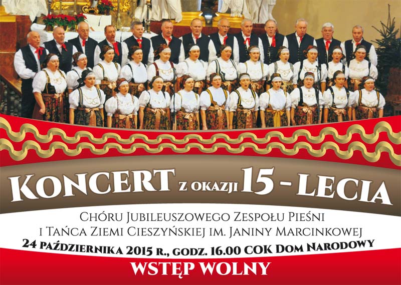 Koncert z okazji 15-lecia Chóru Jubileuszowego ZPiT ZC odbędzie się w sobotę dnia 24 października 2015 r. o godz. 16:00 w sali widowiskowej Domu Narodowego.