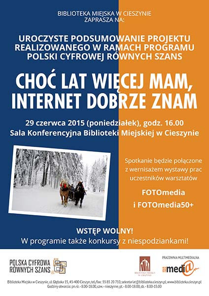 Biblioteka Miejska w Cieszynie zaprasza na uroczyste podsumowanie projektu realizowanego w ramach programu Polski Cyfrowej Równych Szans „Choć lat więcej mam, Internet dobrze znam”. Projekt był realizowany przez Wiolettę Matusiak, Latarnika Polski Cyfrowej.