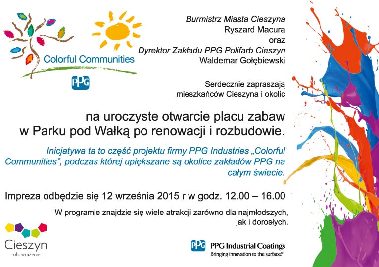Burmistrz Miasta Cieszyna - Ryszard Macura oraz Dyrektor Zakładu PPG Polifarb Cieszyn - Waldemar Gołębiewski serdecznie zapraszają mieszkańców Cieszyna i okolic na uroczyste otwarcie placu zabaw w Parku pod Wałką po renowacji i rozbudowie.