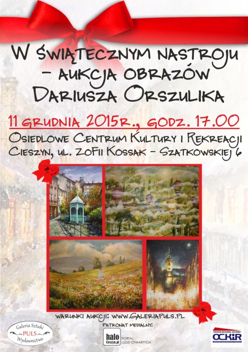 Przy akompaniamencie nastrojowej muzyki czy też w takt gorących rytmów salsy będzie można wziąć udział w wyjątkowej, świątecznej aukcji obrazów Dariusza Orszulika. Ta całkiem nowa propozycja na kulturalnej mapie naszego miasta powstała dzięki współpracy cieszyńskiej Galerii Sztuki PULS oraz Osiedlowego Centrum Kultury i Rekreacji – inicjatywa zrodziła się z chęci upowszechnienia kultury i zwiększenia jej udziału w życiu mieszkańców Cieszyna.