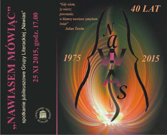 25 listopada o godzinie 17.00 w Domu Narodowym odbędzie się spotkanie jubileuszowe, na które zapraszamy wszystkich członków i sympatyków „Nawiasu”, a także miłośników poezji. W programie m. in.: prelekcja multimedialna „Historia Grupy Literackiej (1975- 2015)", wystawa dorobku artystycznego i spektakl poetycki „Co autor miał na myśli?” w wyk. młodzieży z Gimnazjum nr 1 w Cieszynie.