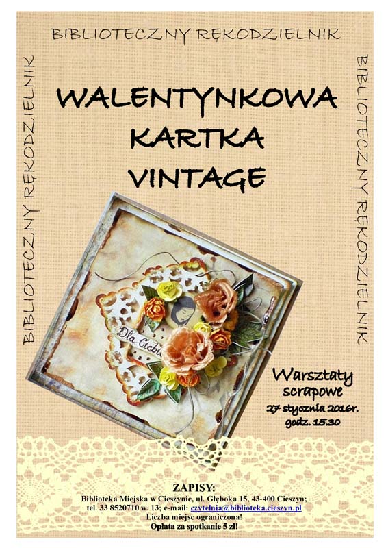 Pierwsze warsztaty - „Walentynkowa kartka vintage” - odbędą się 27 stycznia 2016 r. o godz. 15:30. Uczestnicy wykonają warstwową kartkę, z użyciem najwyższej jakości papierów do scrapbookingu oraz odpowiednich dodatków.