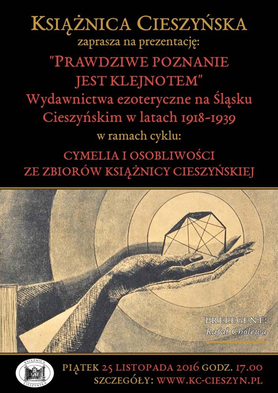 Książnica Cieszyńska, kontynuując cykl pokazów "Cymelia i osobliwości", zaprasza na prezentację, zatytułowaną: "Prawdziwe poznanie jest klejnotem. Wydawnictwa ezoteryczne na Śląsku Cieszyńskim w latach 1918-1939", którą poprowadzi Rafał Cholewa.