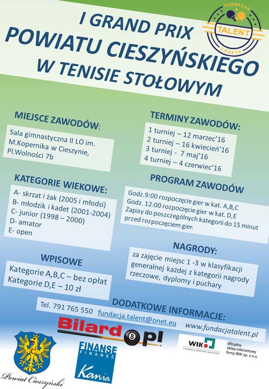 Fundacja Talent Cieszyn zaprasza na cykl zawodów I Grand Prix Powiatu Cieszyńskiego w tenisie stołowym.