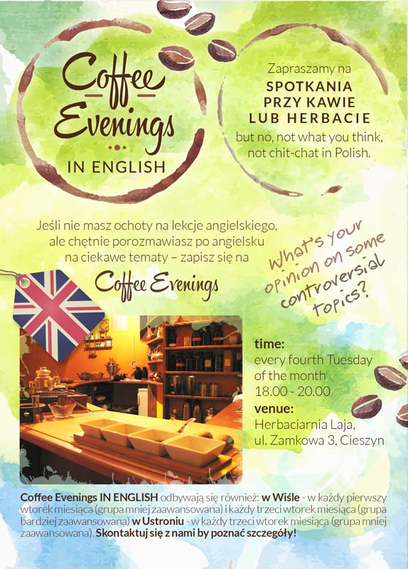 Spotkania w języku angielskim - Coffee Evenings in English! Wszystkich, pragnących swobodnie porozmawiać w języku angielskim na ciekawe tematy zapraszamy do Herbaciarni Laja w Cieszynie na Spotkania przy kawie lub herbacie…po angielsku! Spotkania odbywają się w czwarty wtorek każdego miesiąca.